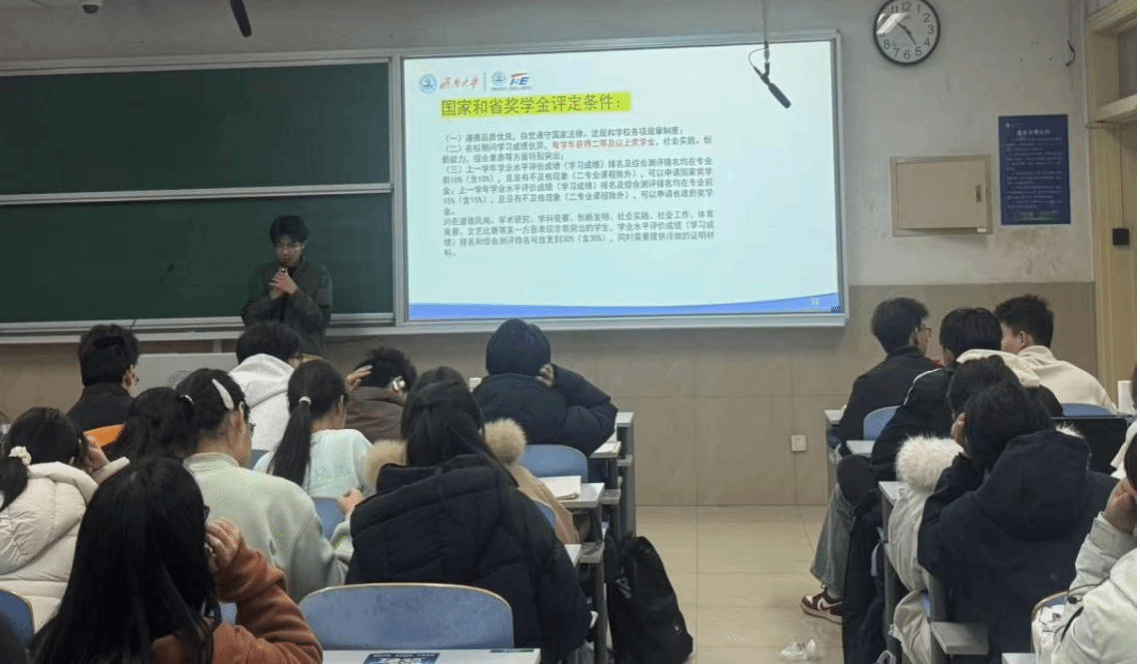 在国家助学金政策板块,宣讲明确了本科阶段三档助学金的资助标准与申报细节,强调对特殊困难学生等重点群体的保障力度,同时给出同学们注意事项。在综合测评板块,则重点解读了综合测评成绩和学业水平成绩与励志奖学金申请的关联。