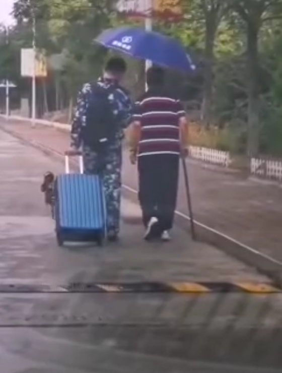 的大一新生秦庆龙在领完新书后,在路上遇见了视频中那位已经80多岁的老人。秦庆龙左手拉着装满新书的沉甸甸的行李箱,雨伞几乎全部遮在老人上方,秦庆龙自己的肩膀和背部露在雨中,他的左半身很快被雨滴湿透,但手中的雨伞仍纹丝不动,老人拄拐慢慢的前进着,他便陪着老人亦步亦趋地向前进着,他那自然而又坚定的举动,让人倍感暖心。伞下的老人是济南大学土木建筑学院退休老教师李秉章,老人对秦庆龙的举动十分感谢。
