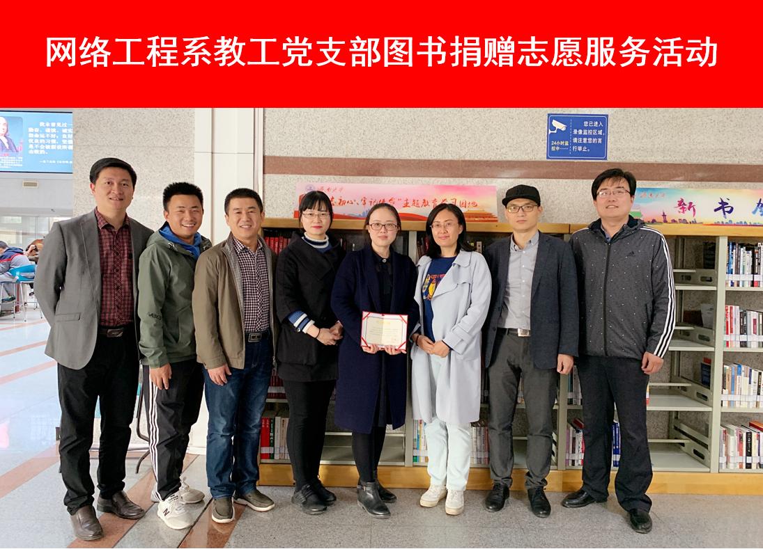 2019年10月30日下午,为贯彻落实学院党委“不忘初心、牢记使命”主题教育工作部署要求,本着“为身边师生办实事办好事”的目标宗旨,网络工程系教工党支部开展了为我校图书馆捐赠图书的志愿服务活动。网络工程系教工党支部部分党员代表参加了捐赠仪式,学院党委委员、副院长荆山同志以普通党员身份参加了本次活动,并带头捐赠图书十余本。