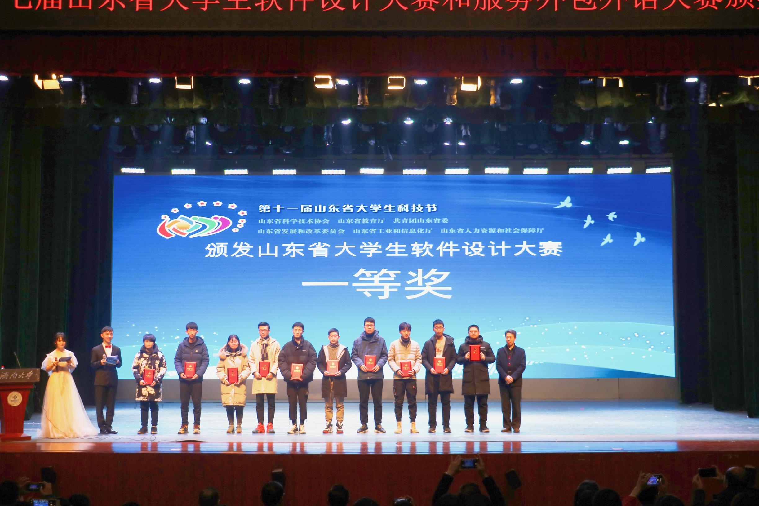 第十七届山东省软件设计大赛共有来自全省75所高校,1300支代表参赛队伍,6000人参赛。经大赛评委会评审,共评出特等奖1项,特等候选奖2项,一等奖97项,二等奖183项,三等奖289项。山东省服务外包外语大赛共评出一等奖9项,二等奖18项,三等奖25项。其中,肉视频