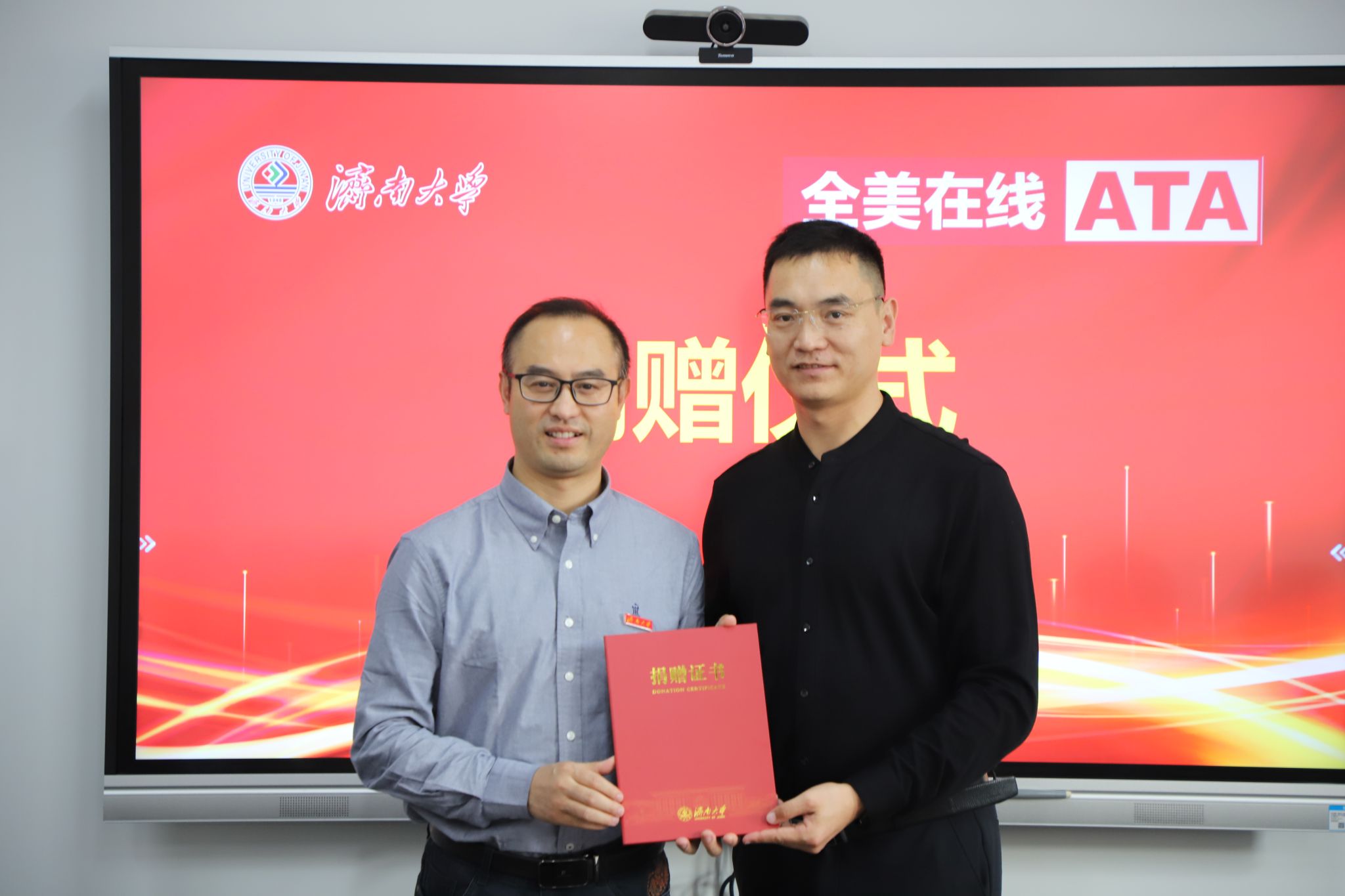 —全美在线(北京)科技股份有限公司捐赠仪式”在第十二教学楼704会议室举行。学校党委常委、副校长黄加栋,全美在线(北京)科技股份有限公司大区经理何青刚,济南大学合作发展处处长刘振,肉视频