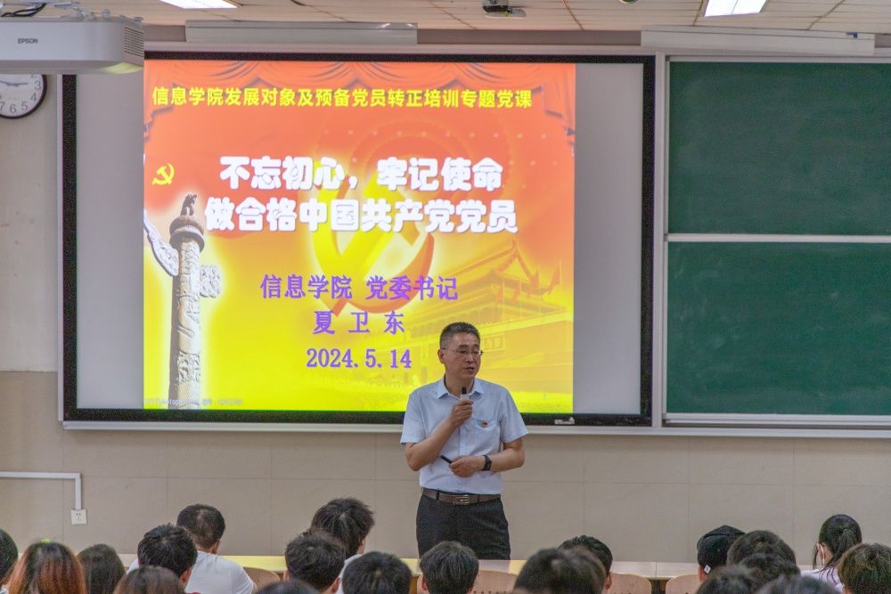 随后,夏卫东以《不忘初心、牢记使命,做合格共产党员》为题进行党课教学。他从“党的百年奋斗历史进程”“党的性质宗旨”“如何加强党性修养”以及“四讲四有——做合格党员的基本要求”等方面,深入浅出向大家讲解了如何做一名合格党员,提醒大家要牢记党的百年峥嵘岁月、传承红色基因、赓续红色血脉,在政治学习上加强理论修养,在专业学习上提升学术水平,在工作和生活中切实践行全心全意为人民服务的根本宗旨。最后,他向大家提出殷切嘱托:新时代、新要求、新使命、新担当,作为新时代青年党员,要不忘初心、牢记使命,在中华民族伟大复兴征程中踏实践行青年人的使命与担当。