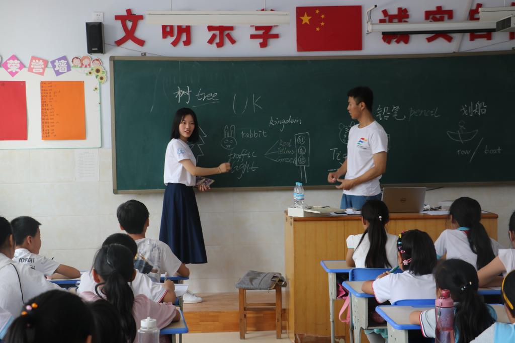 迈进教室,一双双清澈纯真的眼睛望向我们,在一番简单的自我介绍后,我们与30多名孩子一一相识。之后孩子们不断向我们抛出各种问题,热络的询问仿佛我们原来就认识一般,在与他们交流的过程中,我能从他们的眼神中看出他们对我们的到来所表现的欣喜与好奇,之前忐忑不安的心完全平静了下来,我们对今天的课堂充满信心。