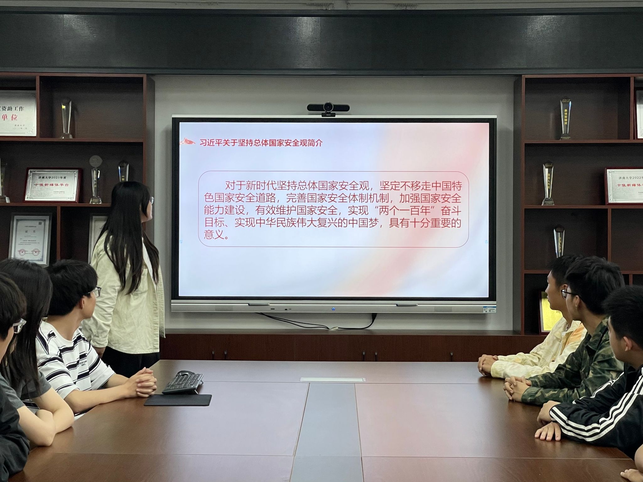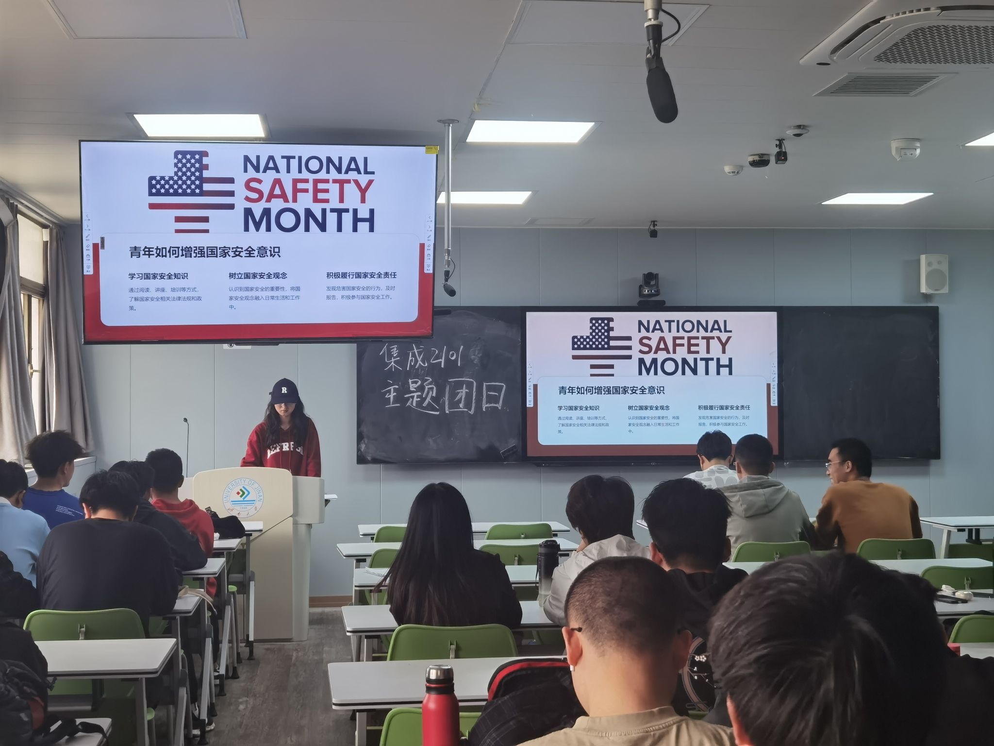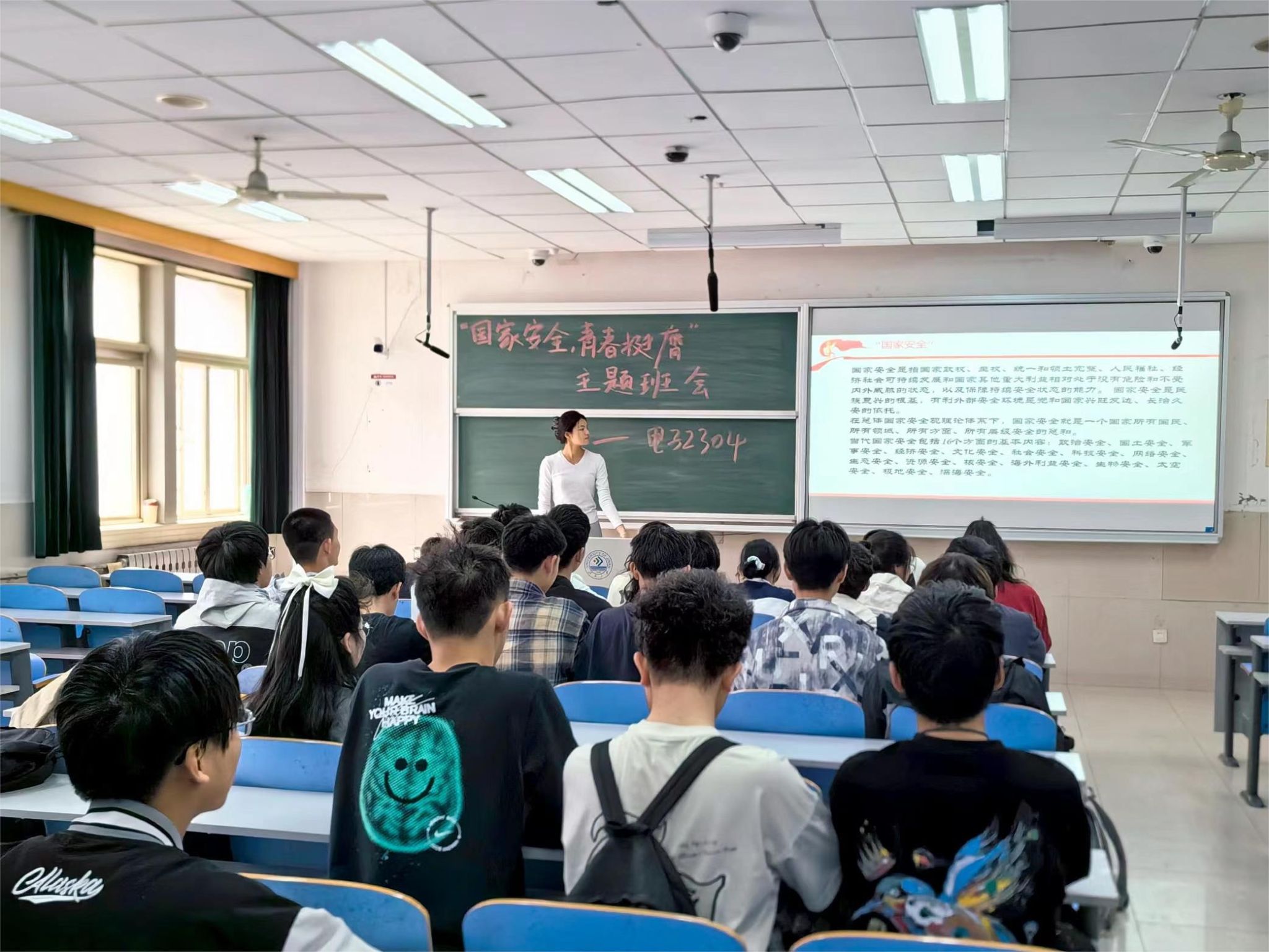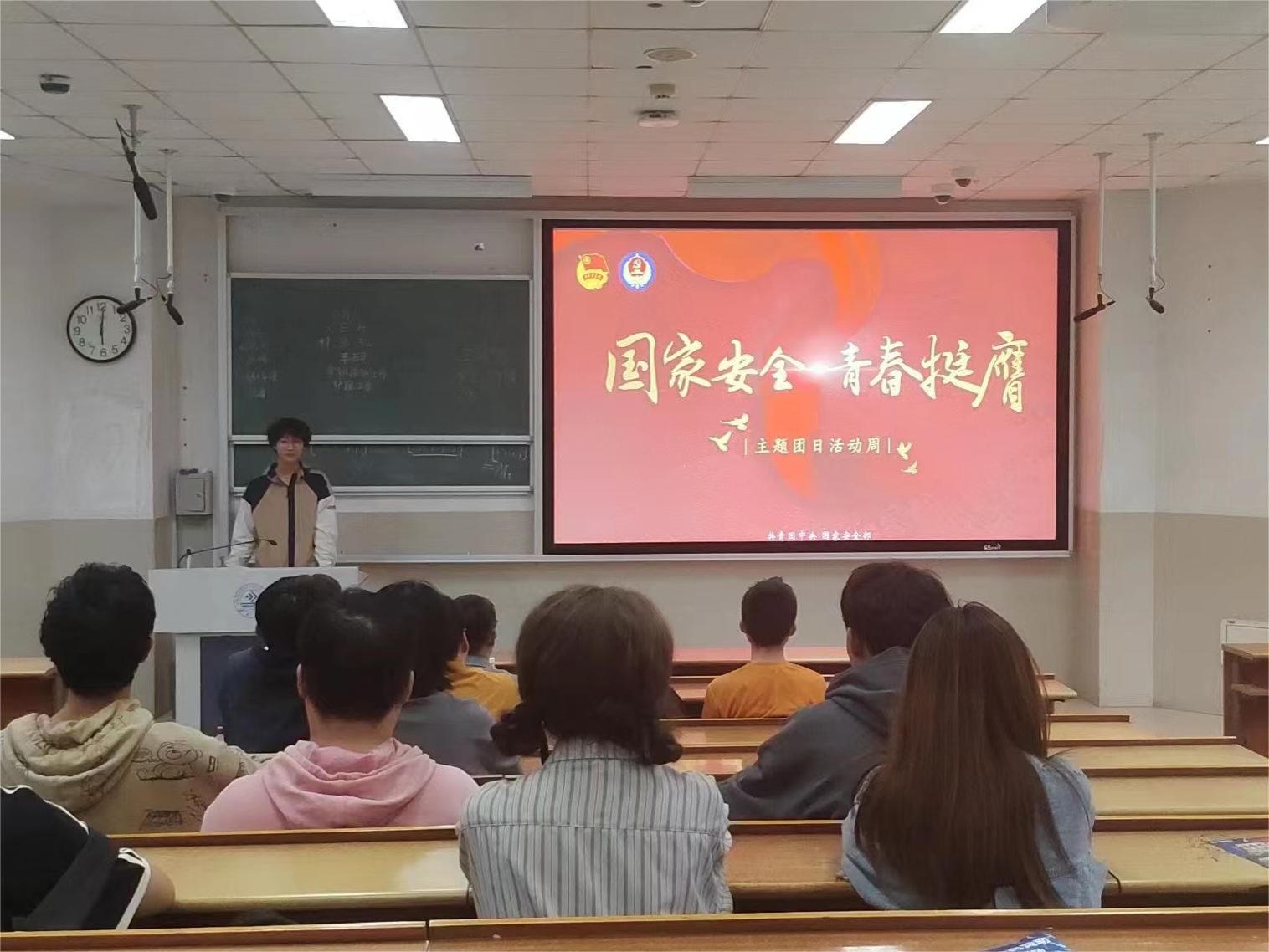 电子2304团支部采用团干部上讲台的形式,由团支书、组织委员、宣传委员依次进行主题宣讲,围绕习近平总书记关于全面加强国家安全教育的重要论述,通过生动的案例和深入浅出的语言,使团员和青年对总体国家安全观有了更加全面和深刻的理解,明确了自己维护国家安全的责任和使命,提高了自我防范意识和能力。