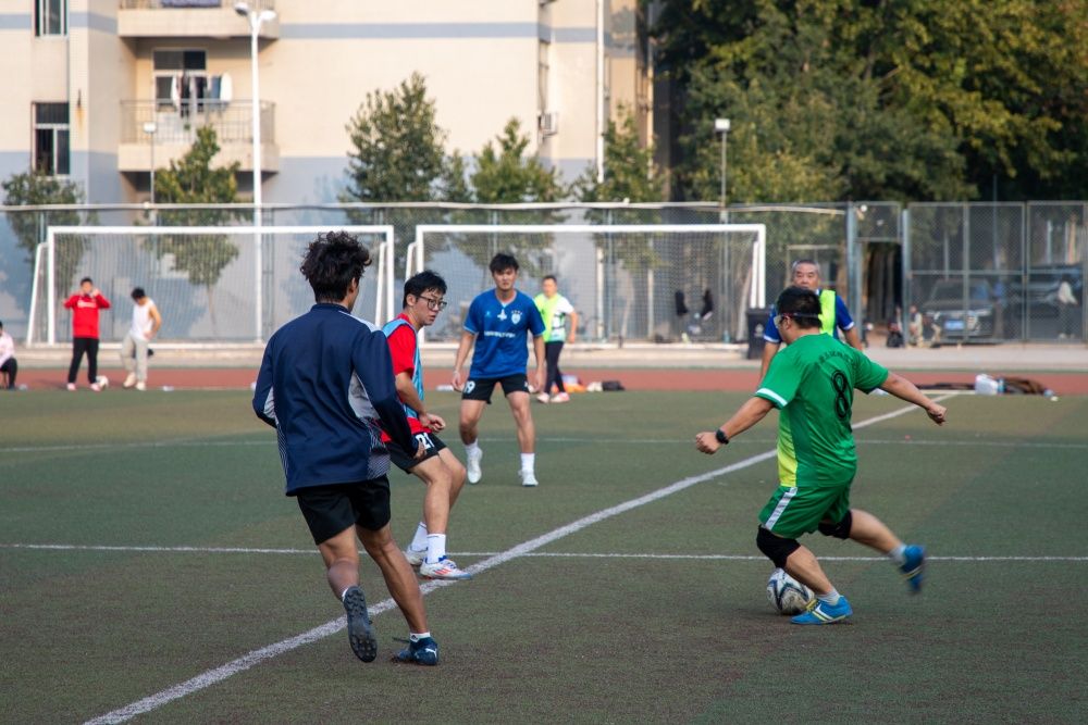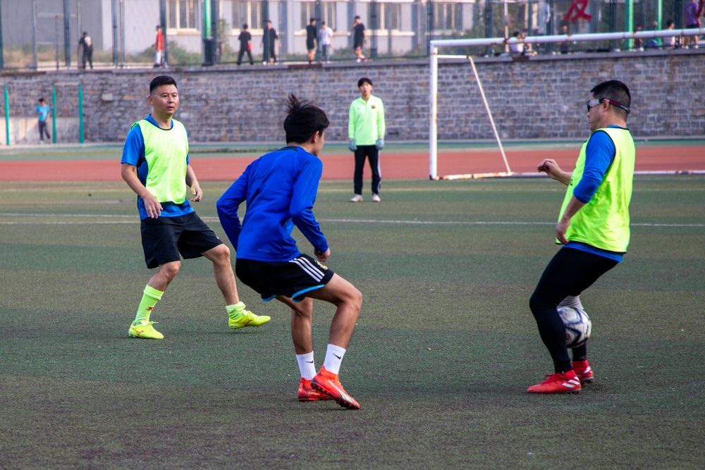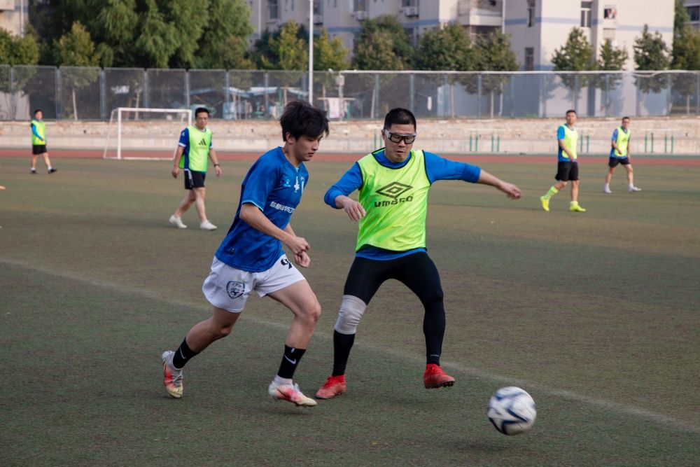 随着主裁判的一声哨响,比赛正式开始,双方球员在绿茵场上展开角逐。学生队球员斗志昂扬,利用出色的中场控球能力率先发动攻势,将球传到教师队的禁区边缘,伺机发起射门,而教工队的球员们则凭借丰富的经验“见招拆招”,有条不紊地防御反击。推射、传球、抢断、射门,师生双方你来我往,引来赛场内外喝彩不断。随着双方球员的全力以赴,比赛进入白热化阶段。阵地进攻、区域防守、盘球过人、舍身扑救,足球在队员之间飞速传递,一幕幕精彩的画面充分展现了师生对运动和生活的热爱。